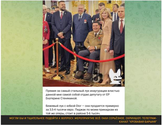 Премию за самый модный образ она выдала депутату Екатерине Стенякиной, что пришла на мероприятие в бежевой юбке за за 3,5-4 тысячи евро (примерно 333-373 тысячи рублей) и пиджаке, что, по приблизительным подсчётам, стоил в районе 5-6 тысяч евро (466-560 тысяч рублей).