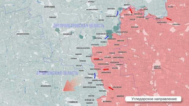 На Днепропетровском направлении западнее Угледара российские подразделения добились продвижения по линии Новониколаевка–Малиновка. После зачистки Полтавок войска закрепились на восточной окраине Успеновки и продвигаются в направлении Новогригоровки, где противник оттеснён к реке Янчур. Этот водный рубеж перекрывает выход к Сладкому, поэтому для дальнейшего продвижения необходимо закрепиться по линии Красногорское–Нововасильевское и установить контроль над Привольным, где русло реки подходит для форсирования. Выше по фронту идёт штурм Алексеевки, российские силы также продвигаются севернее населённого пункта Филия.