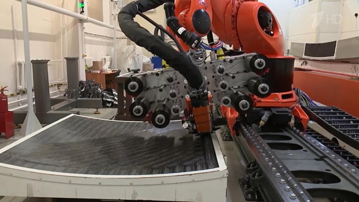 А этот робот должен заменить импортное оборудование для производства композитного крыла, это новейшая разработка российских инженеров: