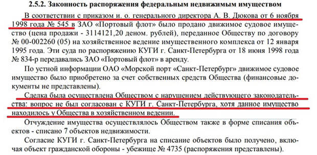 Царьград обнаружил крайне занимательный документ, составленный уже много позже, в 2004 году, по результатам аудиторской проверки питерского Морского порта, проведённой Счётной палатой России (в настоящее время документ удалён с сайта СП, но в распоряжении Царьграда есть копия). Вот выдержки из этого документа: