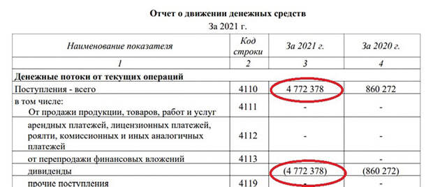 Царьграду удалось получить отчёт о движении денежных средств по этой фирме. Львиную долю поступлений составили дивиденды (почти 4,8 млрд рублей).