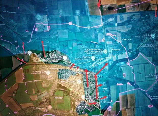 По оперативной информации, ВС РФ прорвались в район посёлок Рог — мясокомбинат — завод Пылеподавления. Если нашим подразделениям удастся закрепиться здесь и выбить противника из посадок у ж/д полотна на Родинское, Мирноград (Димитров) фактически будет окружён.