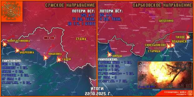 На участке фронта Меловое-Хатнее Бесстрашные продвинулись на 500 м, овладев лесополосой. В ходе продвижения уничтожено до взвода живой силы ВСУ. На Липцовском участке фронта без существенных изменений. Расчеты FPV и артиллерия Северян наносили удары по выявленным огневым точкам, станциям РЭБ и ПУ БпЛА противника в Липцах, — Северный Ветер.
