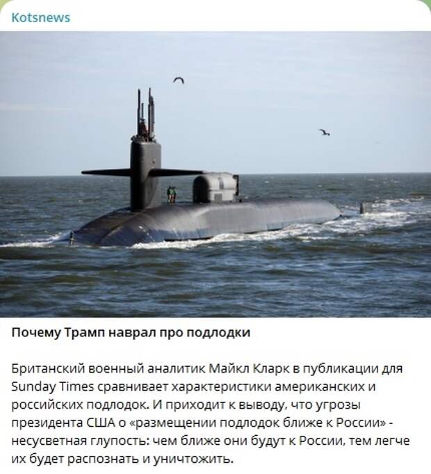 "Они способны отстреляться по России, даже находясь у американского побережья. Смысла перебрасывать лодки ближе к нашим границам (куда? На Балтику? В Чёрное море?) нет никакого. Разве что дать таким образом нашим подводникам возможность срисовать их акустические сигнатуры", - написал Коц в своём Telegram-канале.