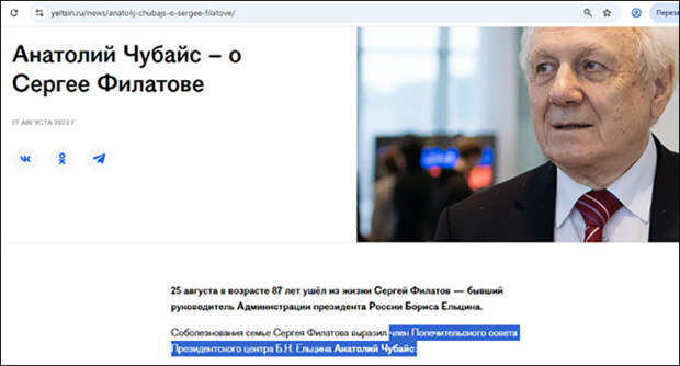 То, что Чубайс член попечительского совета "Ельцин Центра", организация даже не скрывала // Скриншот с сайта yeltsin.ru