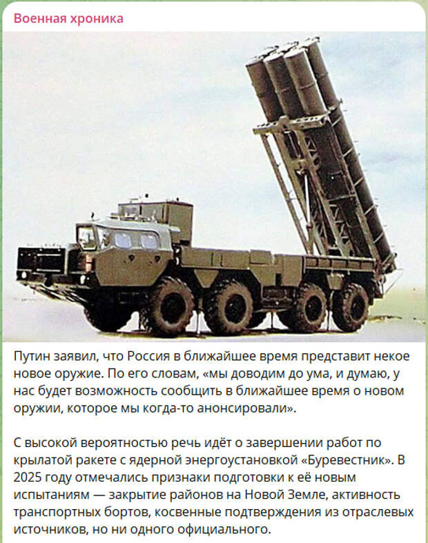 Кроме того, президент отметил, что в ближайшее время Москва анонсирует новое оружие. Несмотря на отсутствие каких-то подробностей, "Военная хроника" полагает, что речь идёт о завершении работ по крылатой ракете с ядерной энергоустановкой "Буревестник" или о возрождении наземного варианта "Калибра" под условным названием "Рельеф" с дальностью полёта 2,6 тысячи километров. В Киеве, естественно, напряглись — "Орешник", например, наши анонсировали прилётом по Днепропетровску.