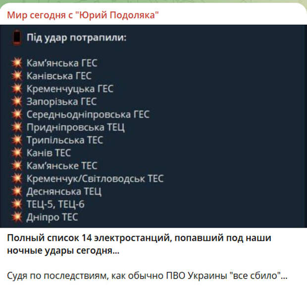 С 28 сентября проводится впервые комбинированная операция по уничтожению почти всего — и инфраструктуры и генерации, и остатков газодобычи, и мостов, и железнодорожной инфраструктуры. Уже четыре массированных удара за всего 13 суток. Полковник обратился лишь с одной просьбой: "НЕ ОСТАНАВЛИВАЙТЕСЬ! А можно бы было один раз и всё! 12 АТР на ОРУ трёх АЭС":