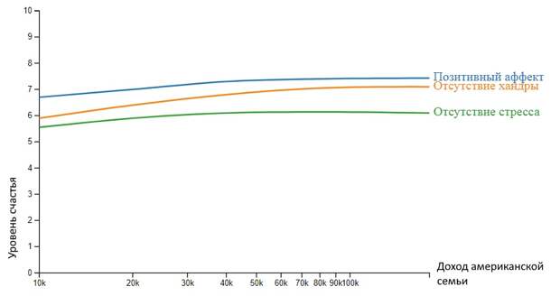 При обсуждении денег и счастья принято ссылаться на нобелевское исследование Канемана-Дитона (ссылка), а точнее, на график из него, где видно, что чем люди богаче, тем они счастливее. Или наоборот: чем счастливее, тем богаче, так как это корреляция, а не причинно-следственная связь. Возможно, довольные жизнью больше зарабатывают именно потому, что чаще пребывают в хорошем расположении духа.