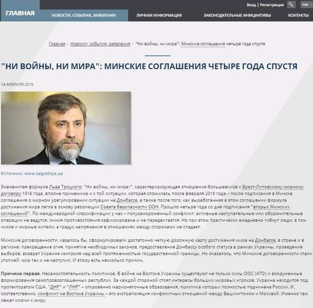 По словам Новинского, причина срыва минских соглашений в том, что слишком много политических и финансовых игроков на Украине, которым выгодно продолжение войны. Украина находится на том последнем временном отрезке, когда вопрос ее будущего будут решать политики других стран. По сути, Украина будет сторонним наблюдателем.