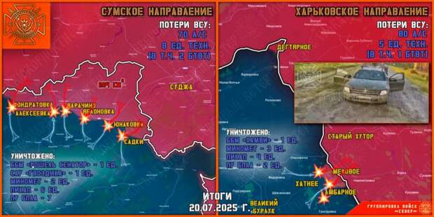 В Сумском приграничье ВС РФ восстановили положение по трассе в районе Кондратовки, а также у северной окраины Андреевки. Выбили противника из нескольких опорных пунктов в Варачино. Продвигаются в районе Юнаковки, западнее реки Локня. Восточнее по фронту штурмуют Мирополье, расположённое на местности со сложным рельефом: высоты, рощи, балки и соединение трех рек – Псёл, Удава и Рыбица.