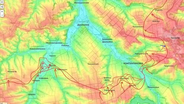 Совсем другая, но не менее напряженная картина разворачивается вокруг Константиновки. Там Южная группировка войск методично сжимает удавку. Началась жестокая рубка за Долгую балку на юго-западе от города. Замысел командования предельно ясен — обойти неприятеля с запада и вывалиться прямиком на Алексеево-Дружковку.