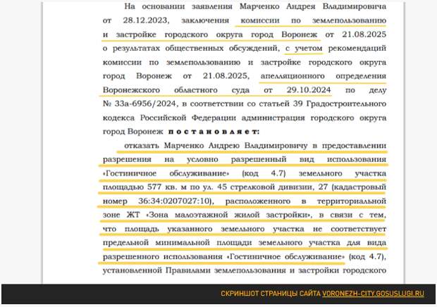 Вот только построен дом был как индивидуальное жильё. Бывает. В декабре 2023-го Марченко решил всё узаконить и обратился в Управление главного архитектора Воронежа. Но получил отказ: площадь участка не соответствовала минимальным требованиям для гостиницы. Коминтерновский райсуд города поддержал мэрию. И тогда бизнесмен опротестовал это решение в облсуде (а для региональных инстанций мнение главы Совета судей страны что-то ведь значит, верно?), где сочли, что городские власти нарушили процедуру, не передав заявление на рассмотрение комиссии и не организовав публичные слушания. Отказ назвали незаконным. Публичные слушания с нулевым количеством участников прошли как по маслу. Однако мэрия сделала непредсказуемый финт — и вновь отказалась признавать "Мартон" гостиницей.