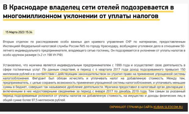А в середине марта 2023-го к Марченко впервые всерьёз нагрянули следователи СКР вместе с оперативниками ФСБ: по материалам налоговой проверки у него выявили неуплату налогов на 97,5 млн.