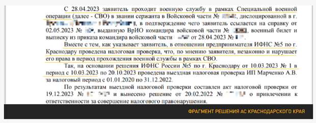 Впрочем, наладить дела это особо не помогло. В октябре уже 2024 года Арбитражный суд Краснодарского края отказал Андрею Марченко в удовлетворении его иска, где он педалировал именно тему незаконности проверки ввиду прохождения им военной службы по контракту в рамках СВО: