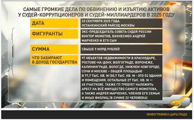 По версии Генпрокуратуры, Марченко "при корыстном содействии Момотова" через суд сумел легализовать 11 объектов недвижимости в разных регионах. Кроме того, в 2018–2019 годах, когда карьера судьи шла в гору, друзья-партнёры "инициировали судебные разбирательства и необоснованно взыскали из бюджета Краснодара более 100 млн рублей по фиктивному спору".