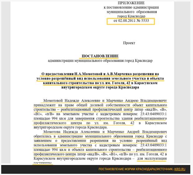 Царьград обнаружил весьма красноречивый документ, прямо указывающий на коммерческие связи Момотова и Марченко. В 2011 году, когда бывший декан уже надел мантию судьи ВС, его мать Надежда Момотова вместе с его другом-бизнесменом получила разрешение мэрии Краснодара на использование здания Центра реабилитации и профилактики граждан (вместе с земельным участком под ним) в качестве гостиницы "Мартон Пашковский". Той самой, что фигурирует в иске ГП.