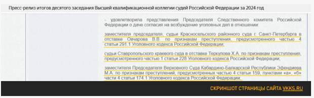 Подвижки начались в 2024-м. В ноябре только на одном 10-м заседании Высшей квалификационной коллегии судей (ВККС) были удовлетворены ходатайства СКР о возбуждении уголовных дел сразу по трём судьям (см. скриншот ниже).