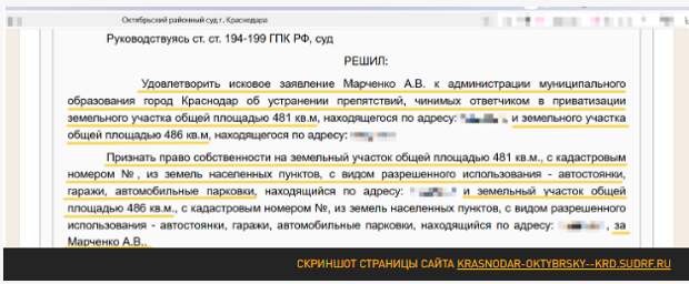 Второе (2017 г.) — о легализации недостроя, который Марченко выкупил у другой фирмы, но забыл поставить на учёт, в связи с чем мэрия Краснодара отказала ему в приватизации здания (после постановки на учёт надо платить налоги). И Октябрьский райсуд кубанской столицы... обязал признать право собственности и на здание, и на участок под ним за Андреем Марченко.