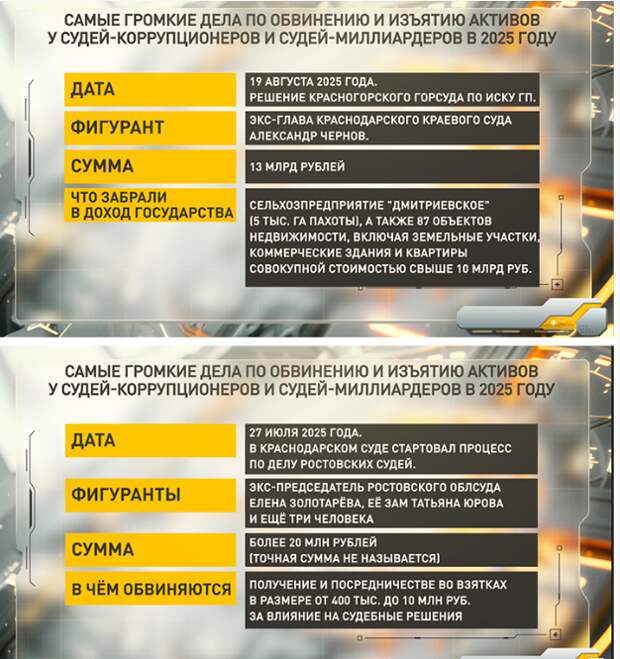 Уже после похорон Подносовой, когда место главы ВС оставалось вакантным, произошёл ряд знаковых событий, связанных с коррумпированными судьями, которые, вероятно, и предопределили имя нового председателя Верховного суда. Благодаря искам Генпрокуратуры в доход государства удалось изъять имущество проворовавшихся судей на общую сумму более 30 миллиардов рублей. И это всего за пару месяцев (см. карточки инфографики ниже).