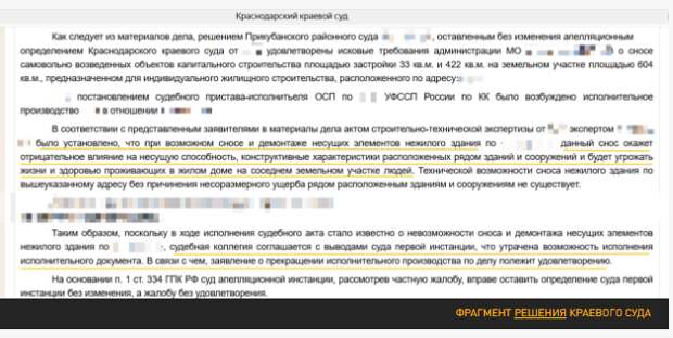Первое (2016 г.) — об отказе исполнить решение Прикубанского райсуда о сносе самовольной постройки, возведённой как частный дом, но используемой в качестве отеля. Судебный пристав, занимавшийся исполнением, с внезапным интересом отнёсся к делу и по собственной инициативе привлёк экспертов, которые выяснили, что сносить гостиницу никак нельзя, поскольку это будет небезопасно для соседних зданий. И краевой суд согласился с инициативным сотрудником: