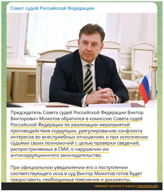 Сам Момотов считает все приведённые в иске сведения "клеветой". В ТГ-канале Совета судей в тот же день, 23 сентября, появилось такое сообщение: