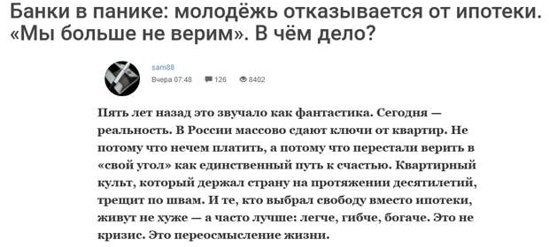 Кстати, раньше буржуазная пропаганда болтала, что не рожают, потому что хОтЯт ПоЖиТь ДлЯ сЕбЯ, попутешествовать по миру и т.д., но, видимо, все сроки "житья для себя" повышли, а воз и ныне там. Теперь вот, оказывается, просто обленились. Это из серии, что люди перестали квартирки в человейниках покупать, ибо